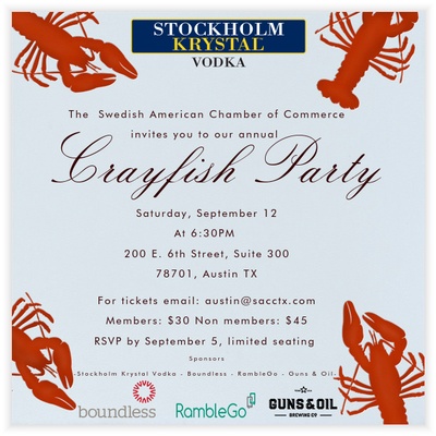 The Swedish American Chamber of Commerce -Austin, invites you to our annual Crayfish Party Saturday September 12 at 6:30PM, 200 East 6th Street.