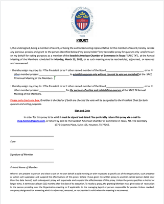 The Swedish American Chamber of Commerce in Texas hereby invites you to the 2025 Annual Meeting of the Members. The meeting will be held virtually only on Monday March 31, 2025 at 12 pm. Attached is the agenda for the meeting.